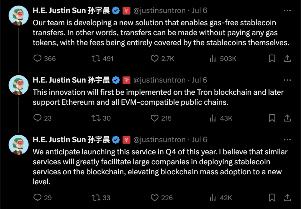 TRON founder Justin Sun announced that his team is developing a stablecoin solution aimed at increasing institutional adoption of such assets. On July 6, Sun revealed that a gas-free stablecoin solution will be launched on the TRON network in the fourth quarter of this year.