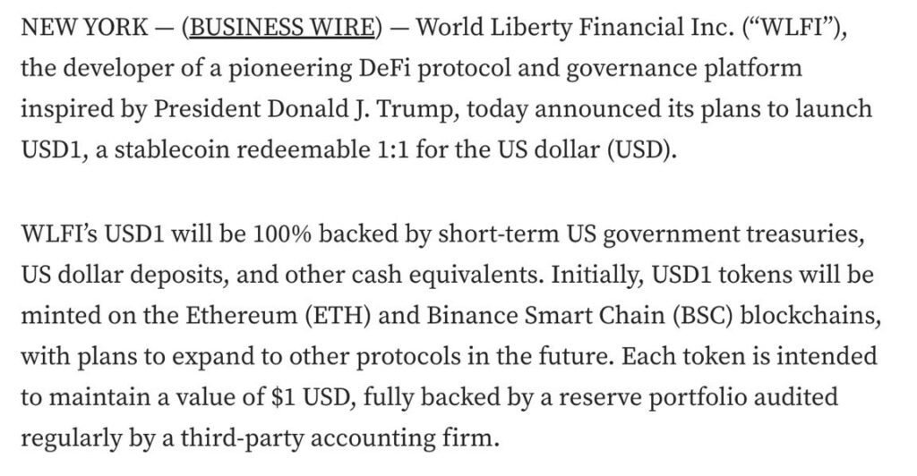 “USD1 provides what algorithmic and anonymous crypto projects cannot — access to the power of DeFi underpinned by the credibility and safeguards of the most respected names in traditional finance.”