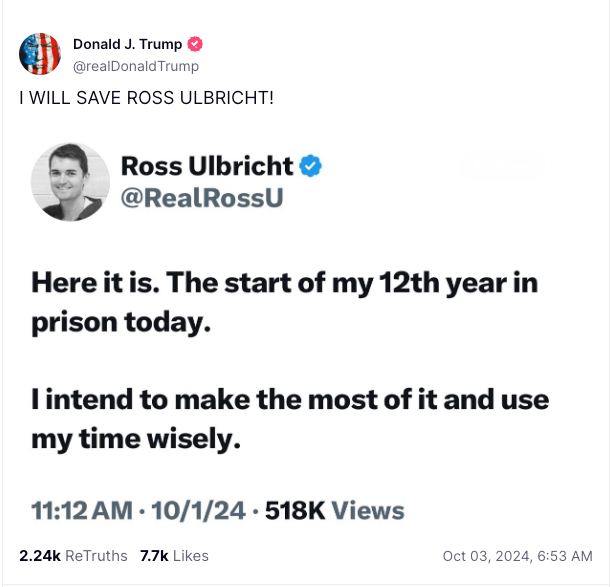 In a Truth Social post on Wednesday, Trump responded to Ulbricht’s remarks about starting his 12th year in prison, stating, “I will save Ross Ulbricht.”
