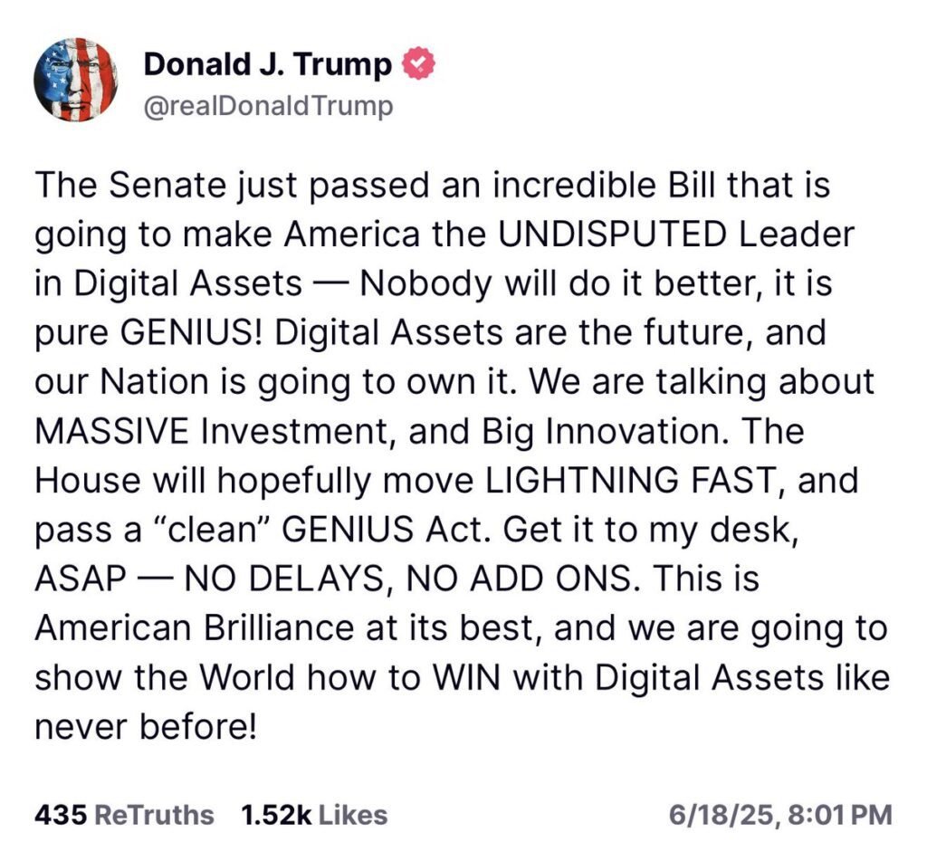 In a post dated June 18, Trump urged the House to move “LIGHTNING FAST” and pass a “clean” version of the legislation without delays or amendments. “This is American brilliance at its best,” he wrote, vowing to show the world how to win with digital assets.