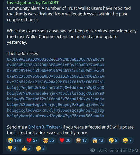 🚨 Security Alert It appears that the @TrustWallet browser extension may have been compromised via a supply-chain attack in the Dec 24 update. Reports indicate that importing a seed phrase into the extension can result in immediate wallet draining. ⚠️ Do NOT use the Trust https://t.co/D2ZMnnkyvj