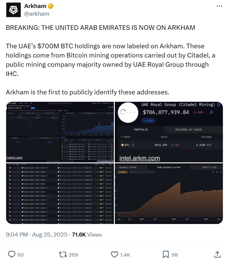 Arkham identified government-linked wallets holding 6,300 BTC mined by Citadel Mining, a company 85% owned by 2pointzero, itself controlled by IHC. IHC is majority-owned by the Royal Group, tied to Sheikh Tahnoon bin Zayed Al Nahyan of Abu Dhabi’s ruling family.