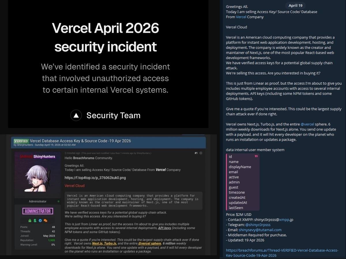 VERCEL GOT HACKED ShinyHunters - the group behind the Ticketmaster breach - is selling Vercel's internal database for $2M on BreachForums here's why every developer should care: - they have NPM tokens and GitHub tokens - Vercel owns Next.js - 6 million weekly downloads - one https://t.co/gzhvtHnMRg https://t.co/tAWYZiTSwA