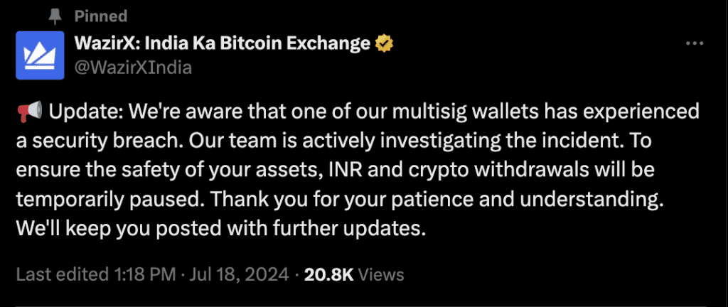 In response to the security breach, WazirX has temporarily halted cryptocurrency and INR withdrawals on its platform. In an X post, the WazirX team stated they are “actively investigating the incident” and will provide updates as the situation develops.