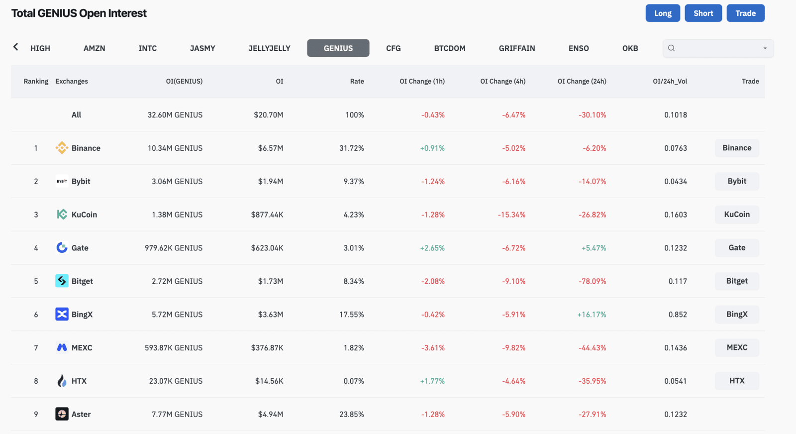 Trading activity remains elevated but shows signs of cooling. CoinMarketCap reports $223.63 million in 24-hour volume, below the $273 million 7-day average tracked via CoinGlass aggregates. Market capitalization stands at $210.1 million, placing GENIUS around rank #172 on CoinGecko.