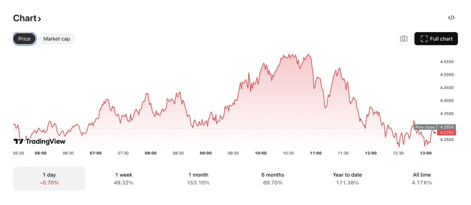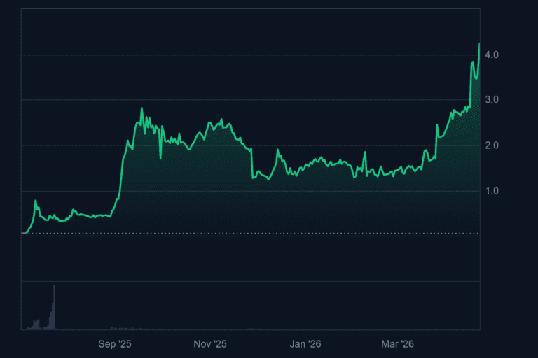 The immediate resistance level is around $4.65, which matches the all-time high swing high reached on April 18, 2026, according to TradingView chart data cited in the research. The key support zone sits around $3.36 to $3.52, based on the April 21 to 22 consolidation area and prior breakout base. The next major historical level above current price is $4.66, based on April 18, 2026 price action and framed only as a historical reference point.