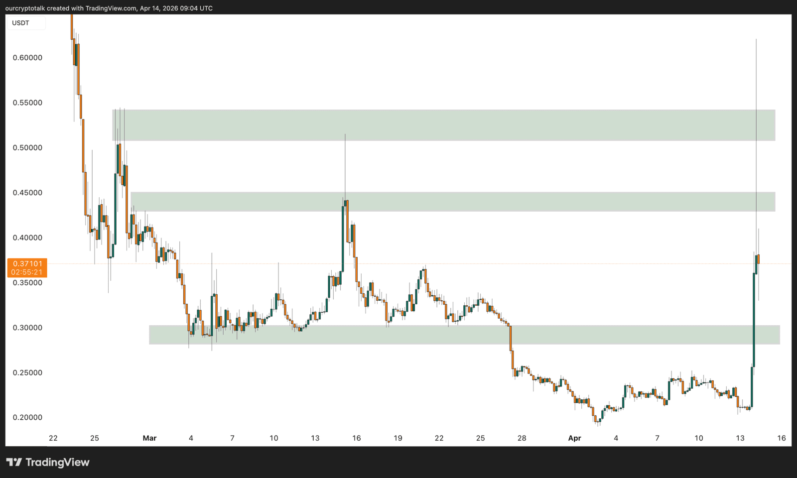 MYX Finance is currently trading below its immediate resistance near $0.60, which marks a recent 24-hour high based on TradingView data. The key support zone sits between $0.25 and $0.30, corresponding to the consolidation range from April 11 to April 13. Above the current resistance, the next major historical level is around $1.00+, based on March 2026 price action. Momentum indicators showed a bullish bias, with price holding above short-term moving averages, although no exact RSI value was available in the latest data snapshot.