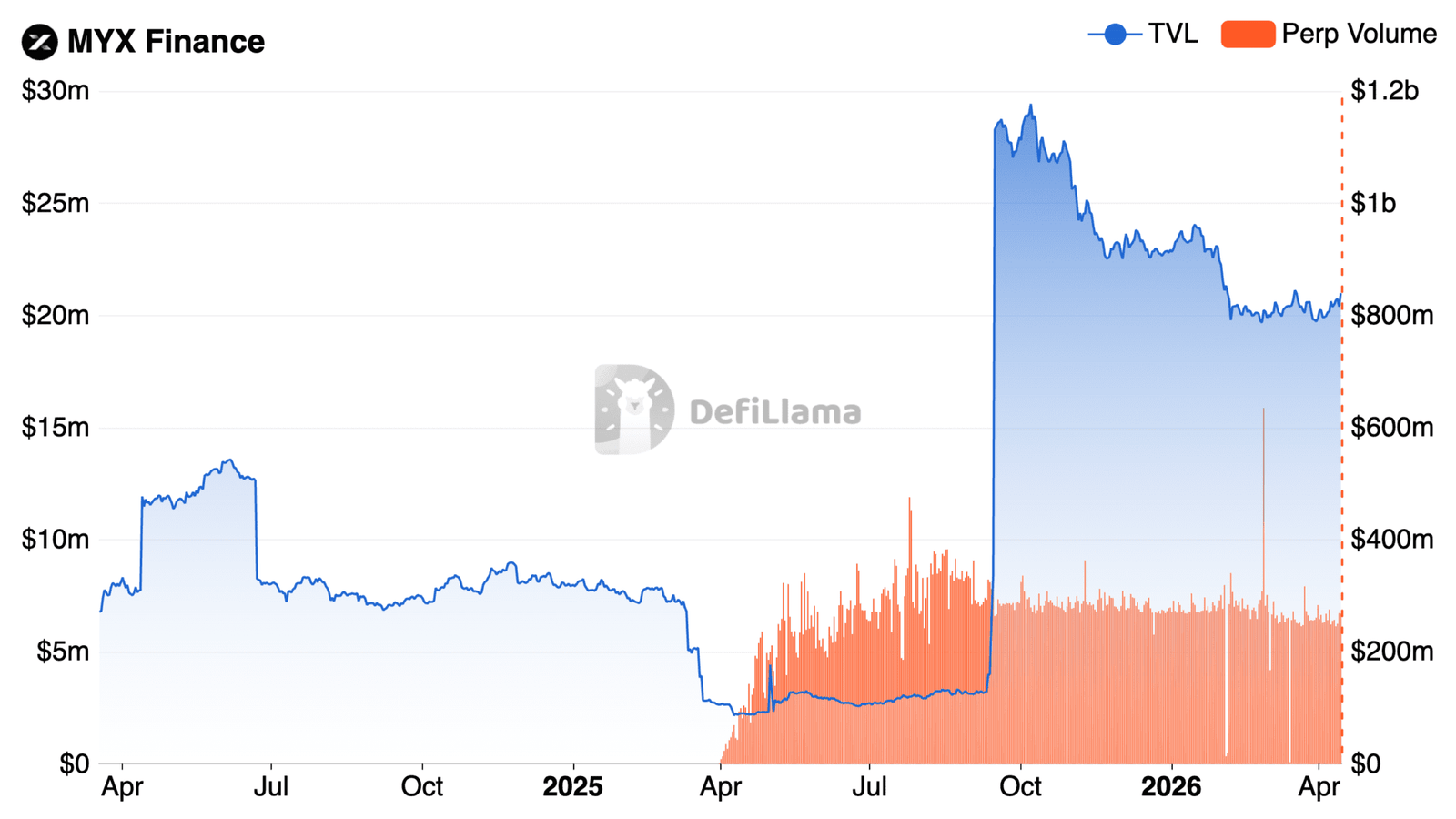 MYX Finance recorded $85,577,650 in 24-hour trading volume, according to CoinGecko, compared to recent daily averages between $10 million and $60 million. CoinGlass data showed open interest at $78.89 million, reflecting sustained derivatives positioning during the rally. The funding rate stood at +0.0471%, indicating a slight long bias among traders. DefiLlama reported total value locked at $21.01 million, with no major short-term change, suggesting the price move remained primarily driven by trading activity rather than new capital inflows.