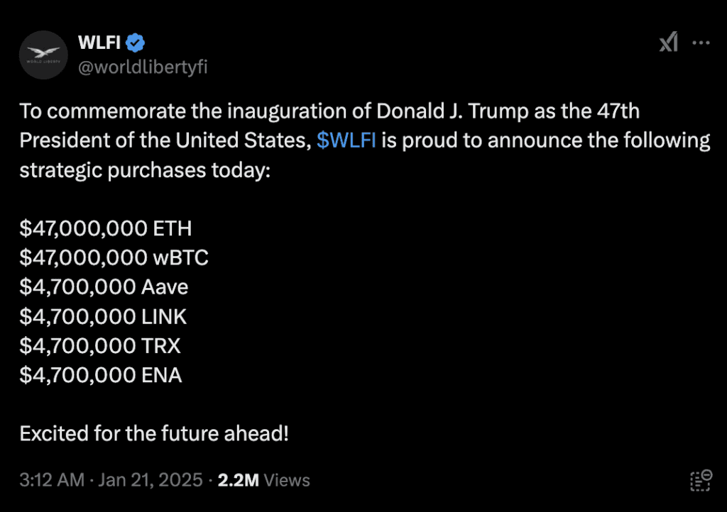 World Liberty Financial (WLF), the DeFi platform affiliated with President Donald Trump, made waves on January 20 by purchasing over $100 million worth of cryptocurrencies ahead of his inauguration. The transactions reflect the platform’s strategic treasury management and alignment with Trump’s pro-crypto stance.
