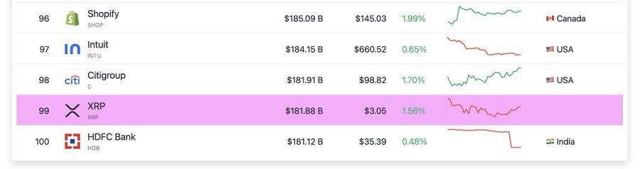 XRP global ranking returns to top 100 with a $181.88B market cap. Analysts see upside toward $3.50–$4.00 as adoption grows.