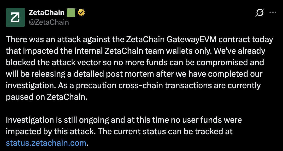 ZetaChain confirmed an exploit against its GatewayEVM contract , with the attack targeting only internal team wallets.